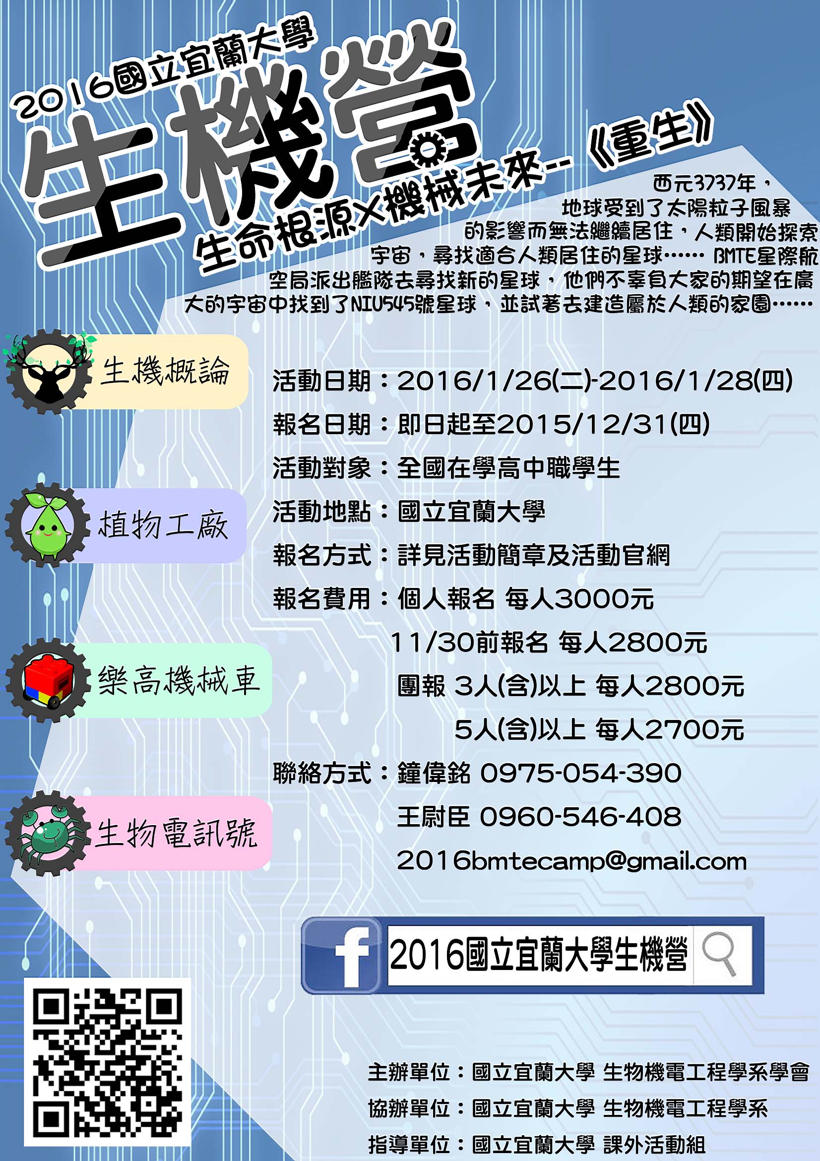 | 2015/11/24 宜蘭大學舉辦「2016國立宜蘭大學生機營-生命根源X機械未來《重生》」活動,請踴躍參加。 |