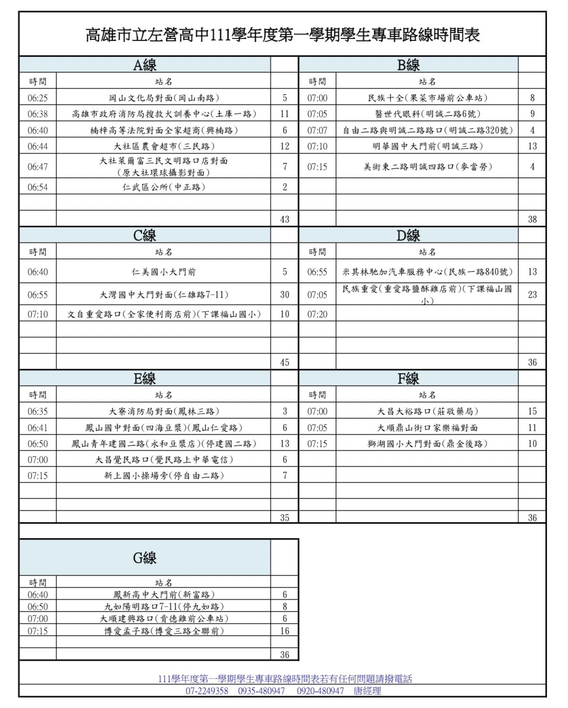 | 2022/09/23 [更新] 111學年第1學期學生交通車座位表/路線時間及搭乘學生名冊(ABCDEFG計7線) |