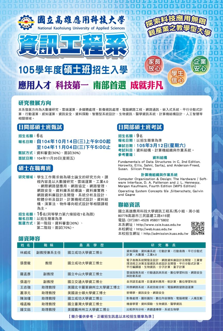 | 2015/11/26 國立高雄應用科技大學資訊工程系碩士在職專班招生 |