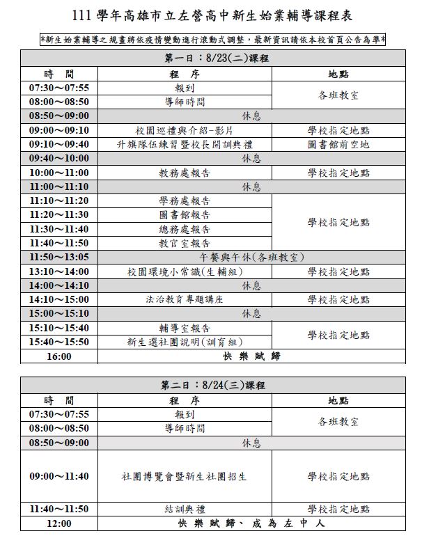 - 新生訓練為111.08.23(二)~110.08.24(三),詳細時間安排請參考下圖。