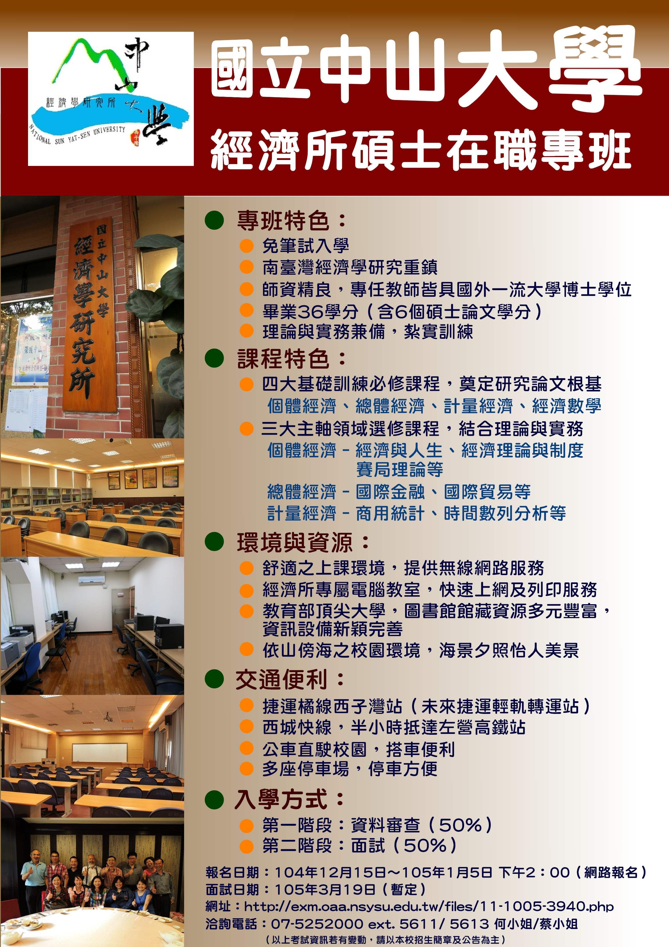 | 2015/11/27 國立中山大學105學年度「經濟學研究所碩士在職專班」招生資訊 |