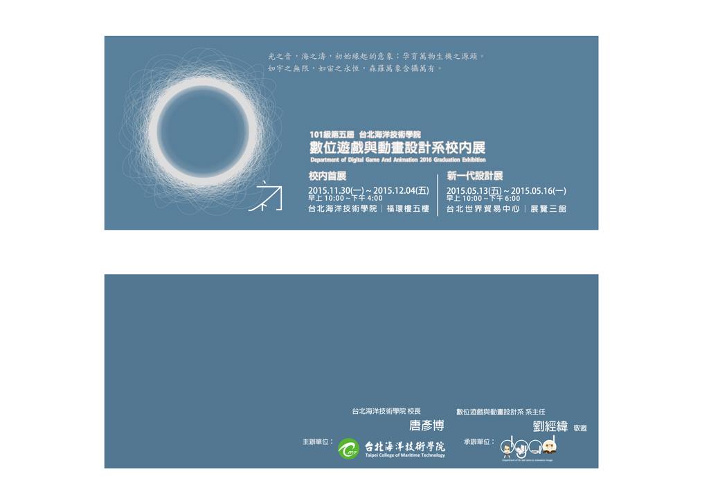 | 2015/11/30 台北海洋技術學院辦理「101級第五屆數位遊戲與動畫設計系校內成果展」,請踴躍參加。 |