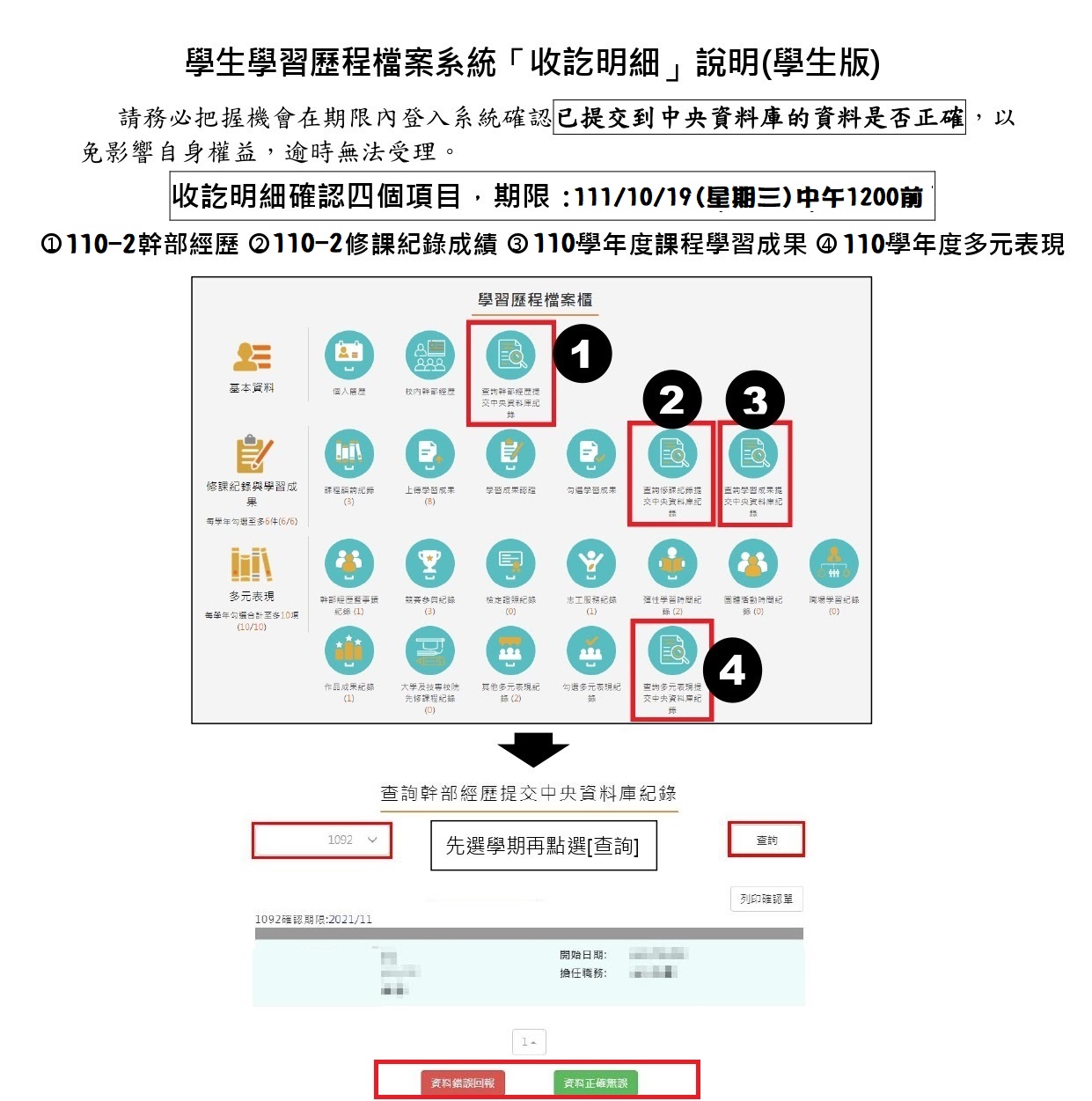 確認收訖項目:1. 1102幹部紀錄 (資料有誤請至學務處更正)
