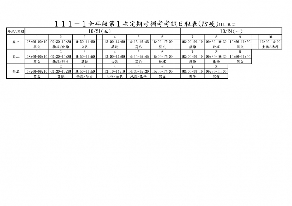 | 2022/10/20 ★111學年度第一次定期考補考 (新增日程表)★ |
