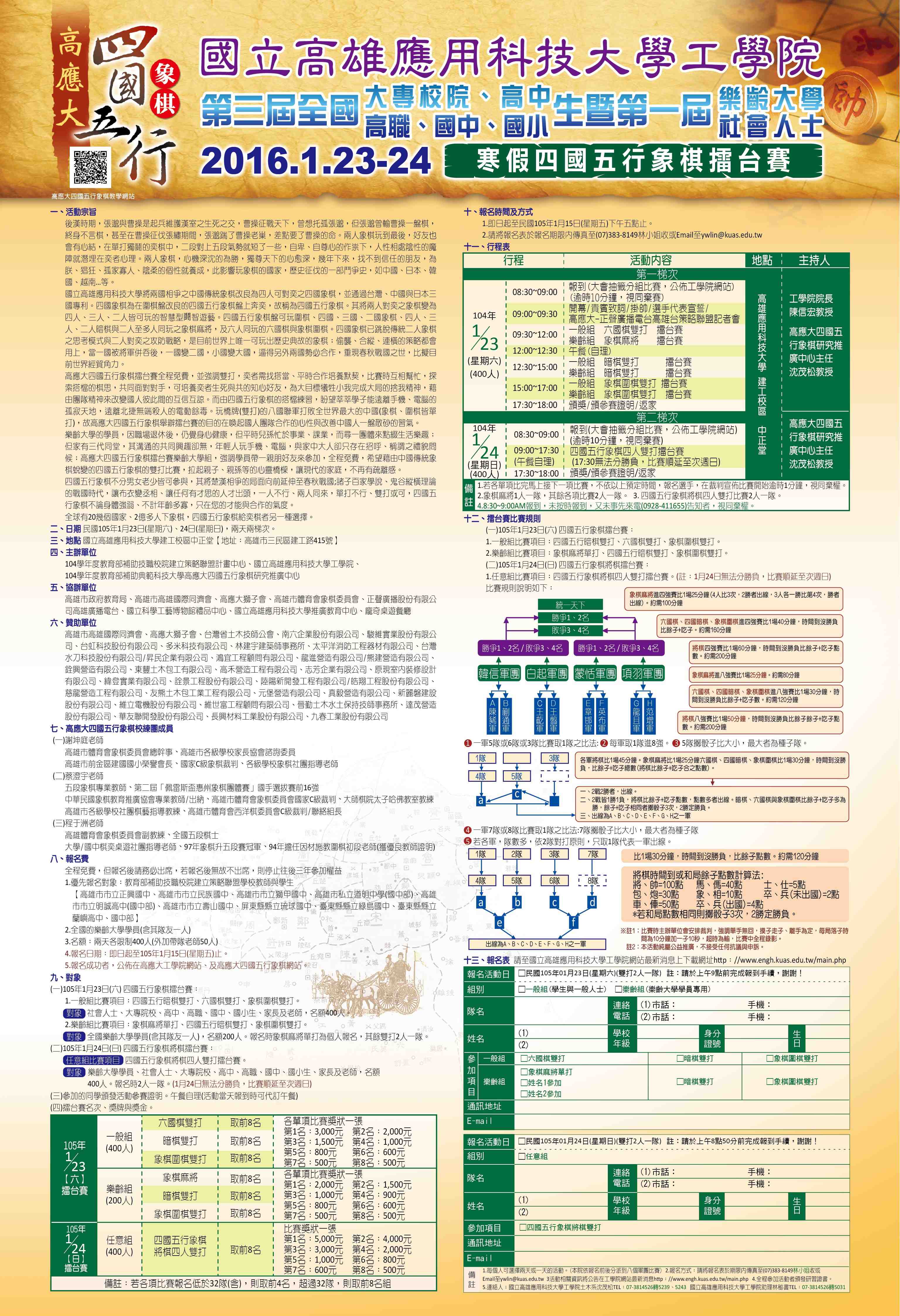 | 2015/12/18 轉知國立高雄應用科技大學辦理第三屆全國大專校院、高中、高職、國中、國小生暨第一屆樂齡大學、社會人士寒假四國五行象棋擂台賽。 |