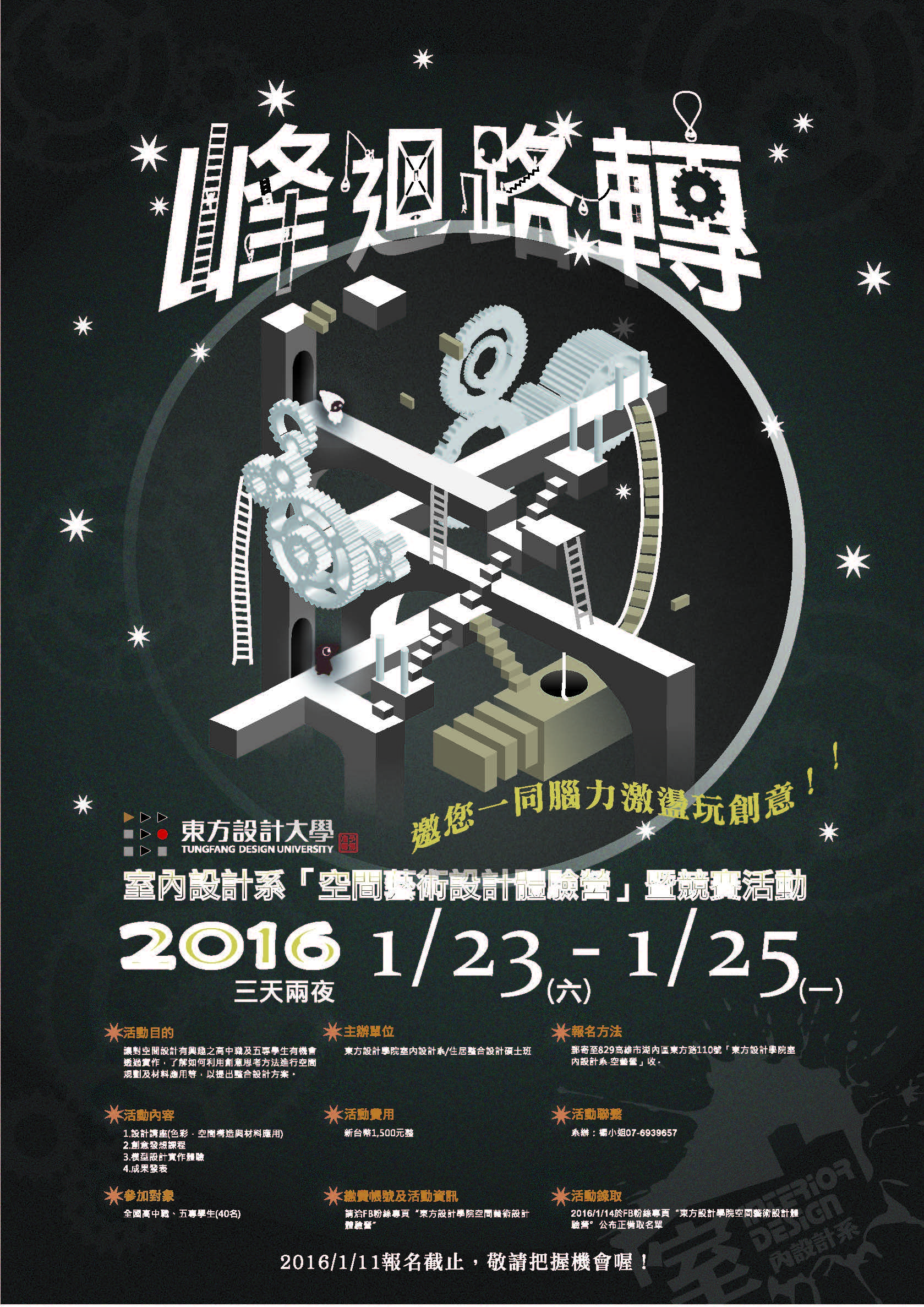 | 2016/01/04 轉知東方設計學院系訂於辦理「峰迴路轉-第一屆空間藝術設計體驗營」暨競賽活動 |