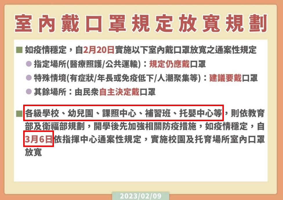 其中,各級學校於開學後先加強相關防疫措施,如疫情穩定,自"3月6日"依指揮中心通案性規定,實施校園及托育場所室內口罩放寬(請參考下圖)。