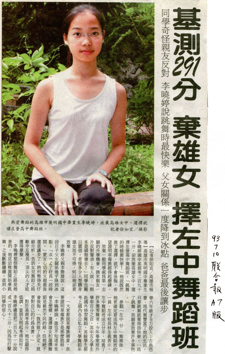 930710舞蹈班李曉婷基測291放棄雄女(聯合報)