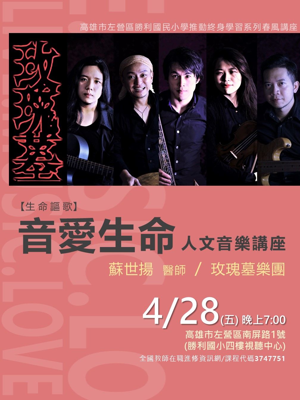 (二)第二場次:講題『生命謳歌-音愛生命(玫瑰墓樂團)』,時間112年4月28日週五19:00,研習代碼3747751。