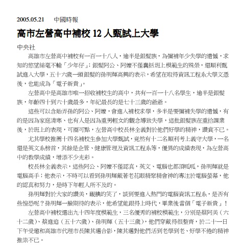 940521左營高中補校12人甄試上大學(中時電子報)
