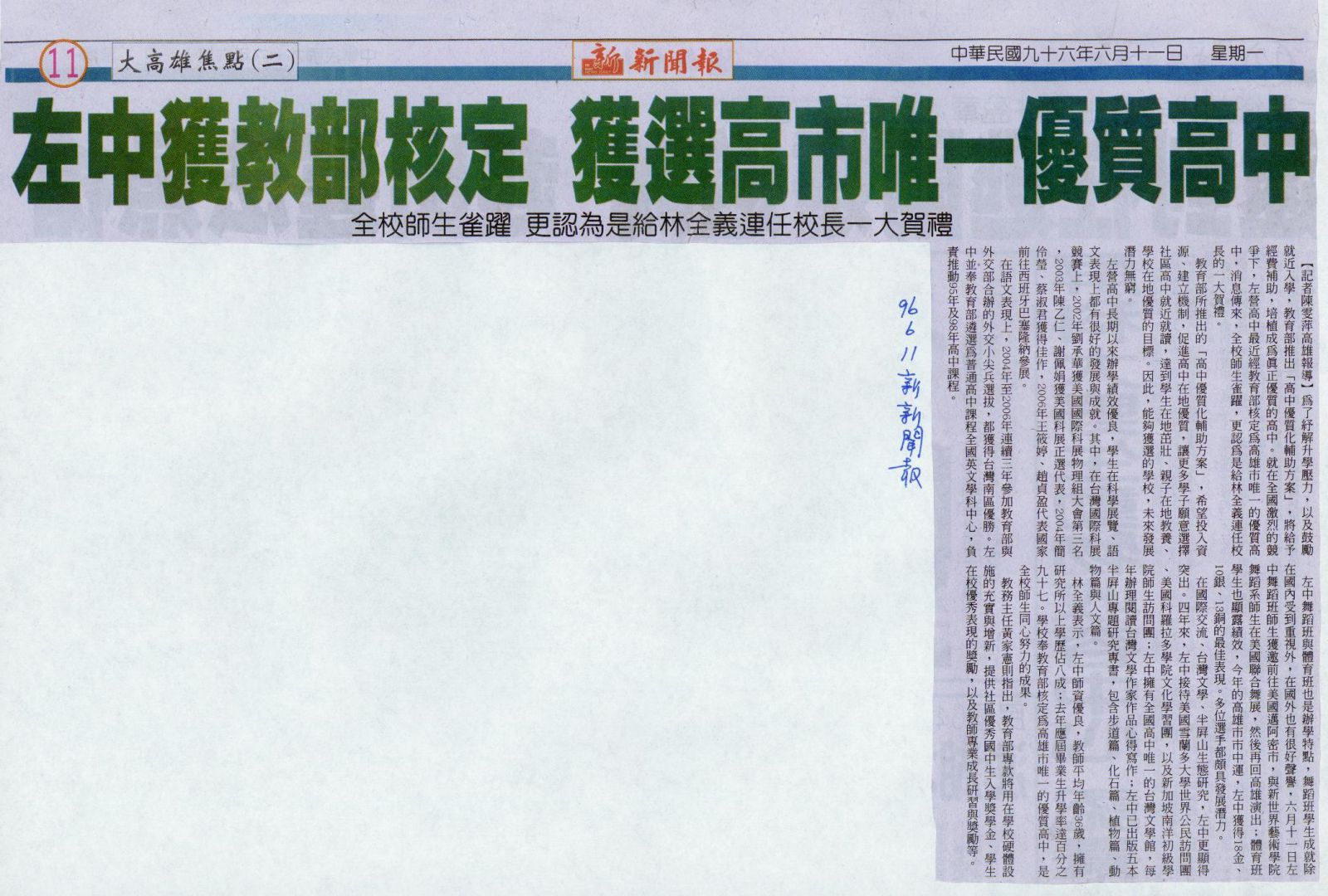 960611左中榮獲教育部核定,高雄市唯一優質高中。