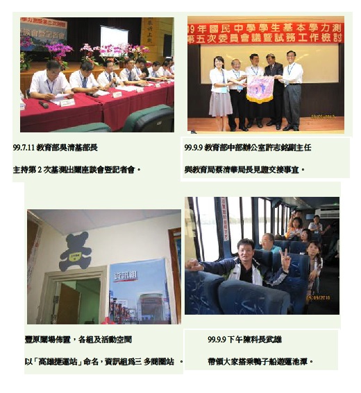 99年5月11日(星期二)第1次入闈豐原闈場,蔡局長期盼全國基測檢討會時,帶大家坐鴨子船遊左營蓮池潭體驗高雄之美, 99年9月9日 (星期四)下午會議結束後,參與人員分2批乘坐鴨子船,雖然當時因颱風下雨影響,大夥們仍興致高昂快樂出航,留下難忘的回憶。