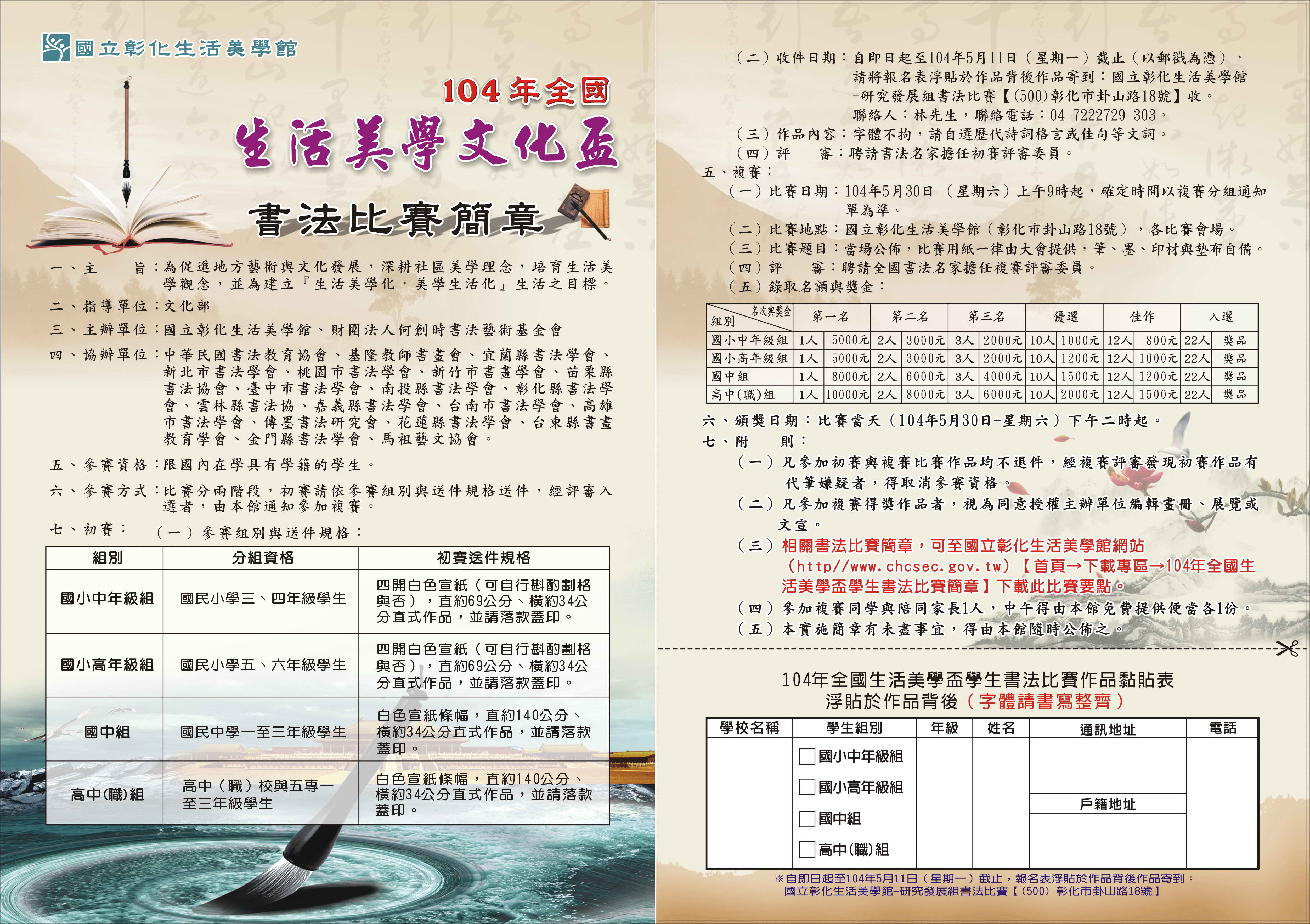 三、相關活動訊息可至國立彰化生活美學館網站(http//www.chcsec.gov.tw)【首頁→下載專區→104年全國生活美學盃學生書法比賽簡章】下載。