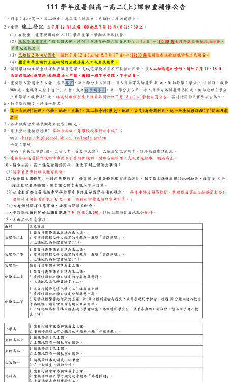 附加檔案:111學年度高一、高二(上)暑假重補修公告.pdf (92.23 KB)