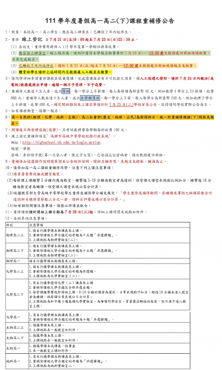 附加檔案:111學年度高一、高二(下)暑假重補修公告.pdf (286.02 KB)