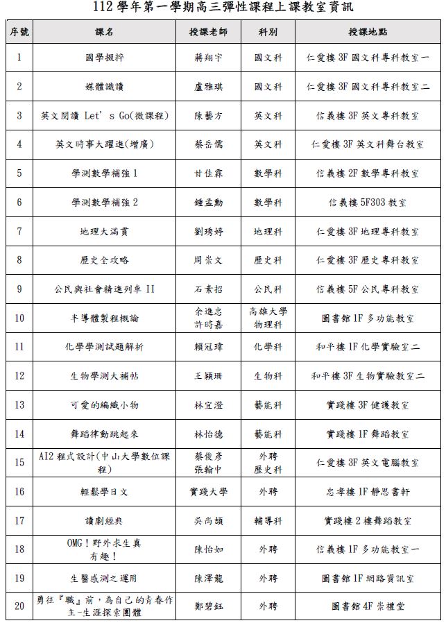 | 2023/08/29 112學年第一學期高三彈性學習時間微課程/增廣補強課程-選課結果及上課地點 |