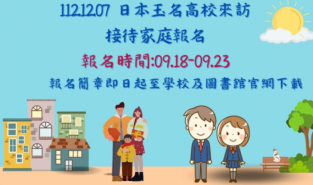 1.本校的姊妹校日本專修大學玉名高校將於今年學校校慶時來訪,本校預計於112年12月7日下午至12月8日中午,接待玉名校學生12位、師長2位,進行校際交流活動,參與本校校慶活動並實際體驗本校特色課程與走訪在地文化地景。12月7日當晚玉名高校學生將入住本校招募的接待家庭,進行生活語言互動及體會異國家庭文化。
