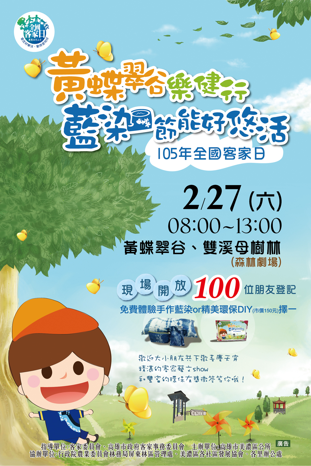 | 2016/02/17 轉知高雄市美濃區公所舉辦「105年全國客家日:黃蝶翠谷樂健行,藍染節能好悠活」活動 |