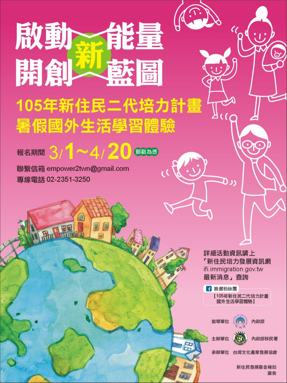 | 2016/03/04 「105年新住民二代培力計畫-暑假國外生活學習體驗」 |