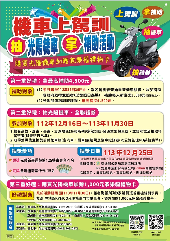 澎、東地區「機車上駕訓 抽光陽機車 拿補助活動」.