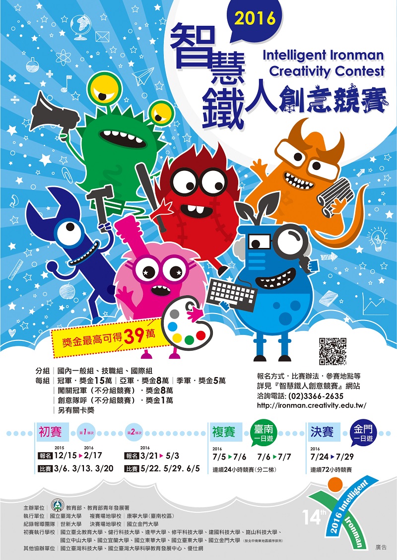 教育部青年發展署「105年度智慧鐵人創意競賽」初賽第2梯次報名定於105年3月21日至5月3日止,敬請踴躍報名參加。
