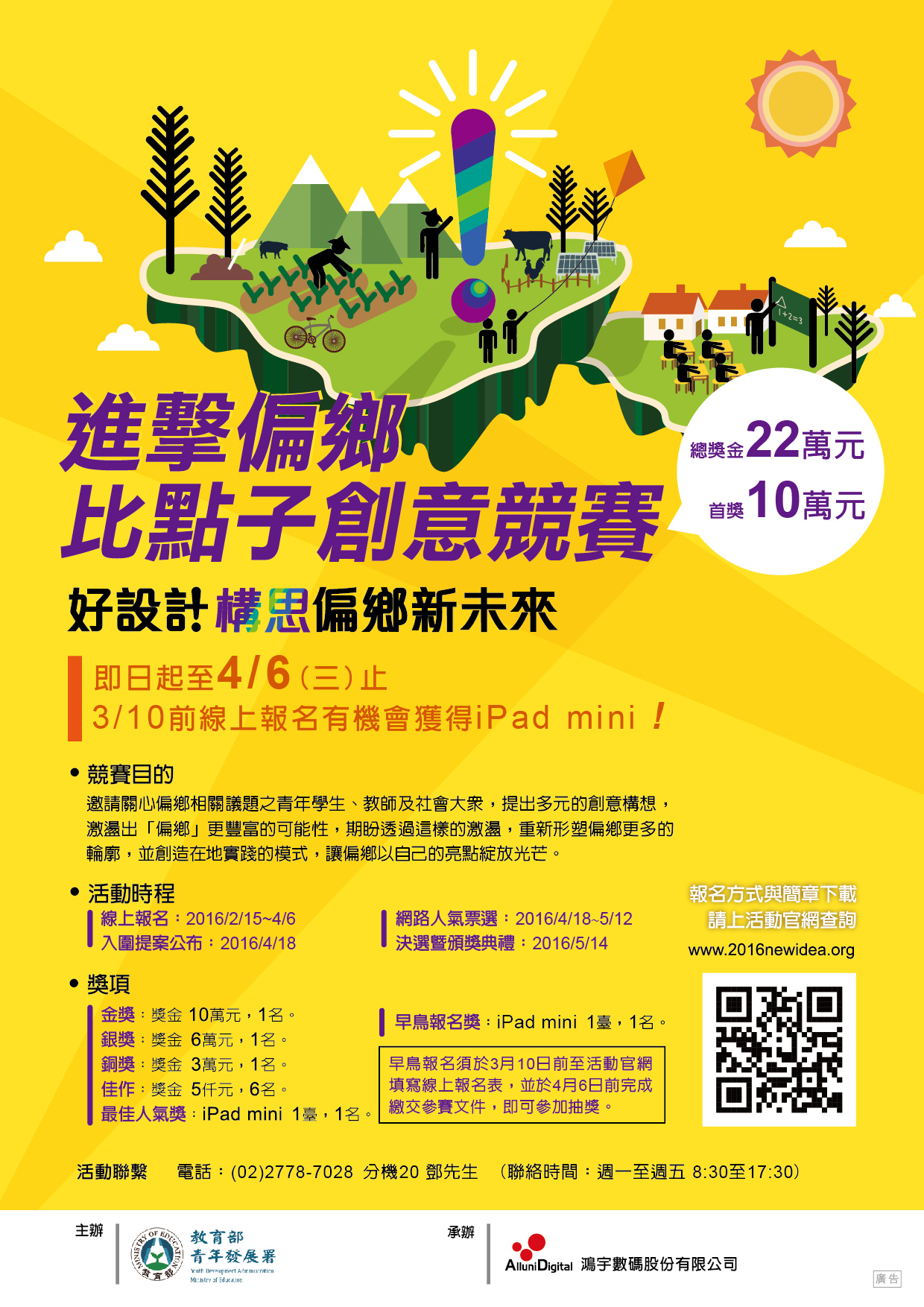 四、「進擊偏鄉比點子創意競賽」徵件時間為本(105)年2月15日至4月6日,參加資格不限,參加須於期限內上傳提案至活動官網,本年4月18日公布入圍提案、4月18日至5月12日進行網路票選、5月14日辦理決選暨頒獎典禮。詳情請見活動官網(www.2016newidea.org)或洽該案青年署承辦人:袁先生,電話:02-7736-5427。