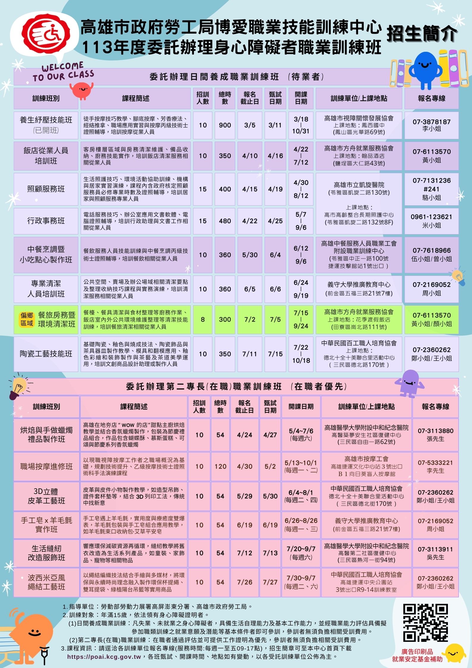 詳細招生訊息請洽詢各訓練單位或至中心網站首頁最新消息處下載各職類班招生簡章與報名表(https://poai.
