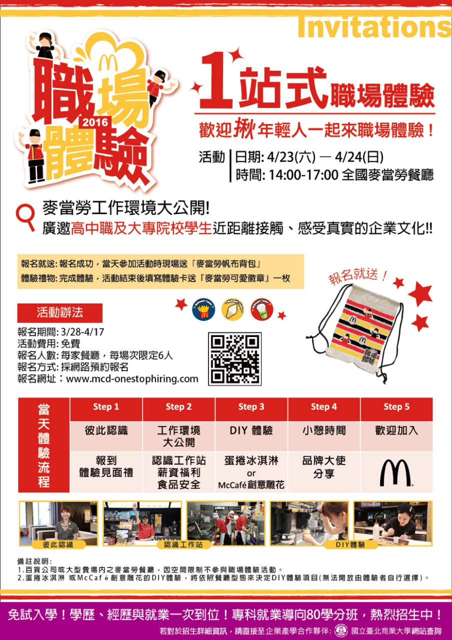 | 2016/03/25 轉知臺北商業大學與麥當勞合作辦理「2016年台灣麥當勞One Stop Hiring職場體驗活動」 |