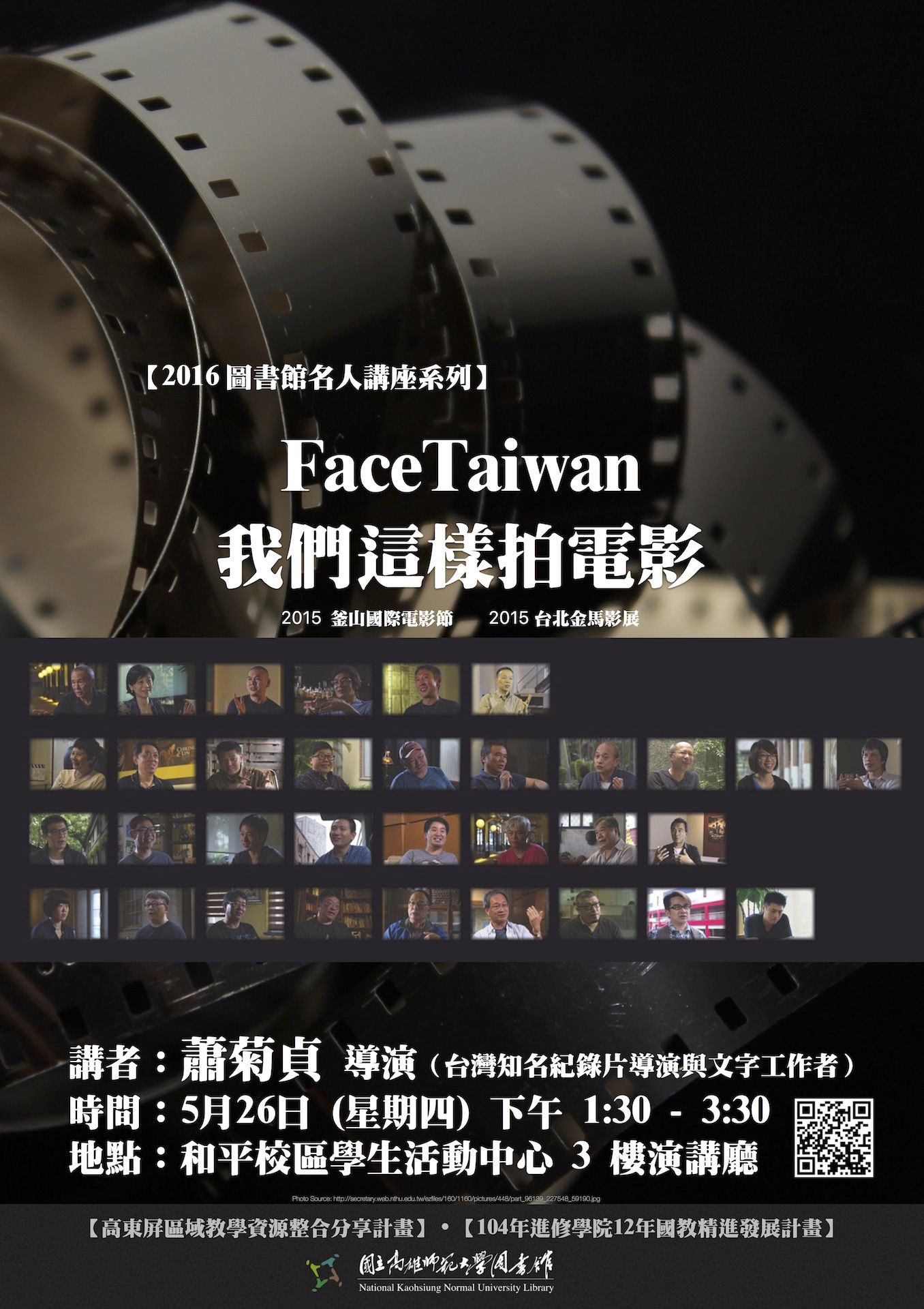 2、第二場:我們這樣拍電影(台灣知名紀錄片導演與文字工作者-蕭菊貞導演主講),105年5月26日 (星期四) 下午1時30分至3時30分,國立高雄師範大學和平校區學生活動中心3樓演講廳。