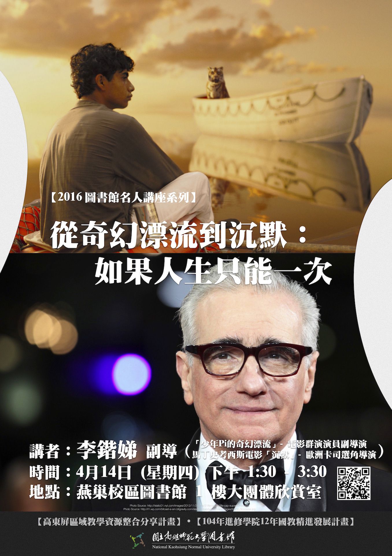 1、第一場:從奇幻漂流到沉默:如果人生只能一次(「少年Pi的奇幻漂流」電影群演演員副導-李鍇娣主講),105年4月14日 (星期四) 下午1時30分至3時30分,國立高雄師範大學燕巢校區圖資大樓1樓大團體欣賞室。