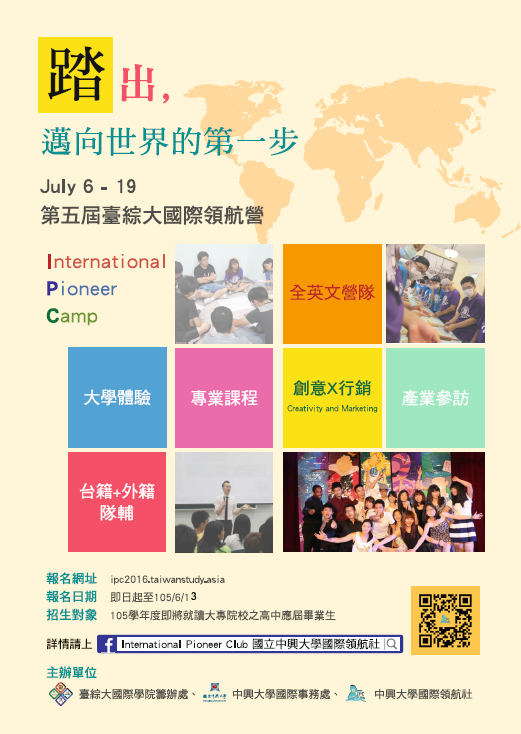 線上報名活動網址:http://ipc2016.taiwanstudy.asia/, 報名截止日期6月13日。