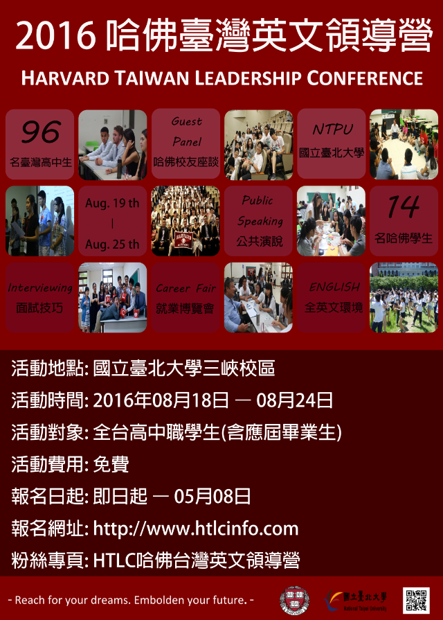 | 2016/03/31 轉知臺北大學辦理「2016國立臺北大學哈佛臺灣英文領導營」 |