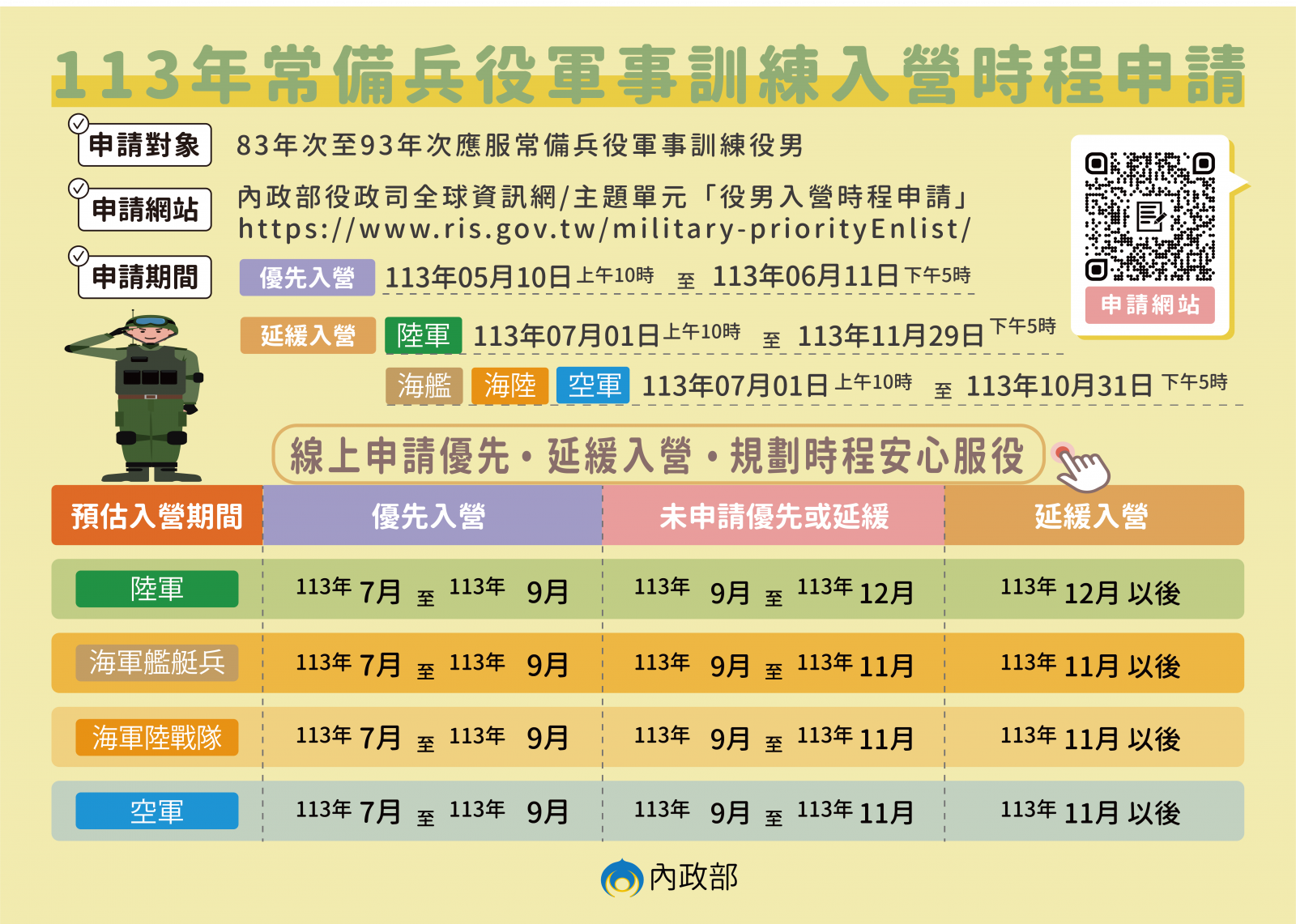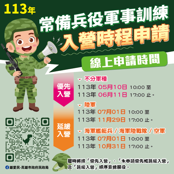 「113年常備兵役軍事訓練役男入營時程方案」申請