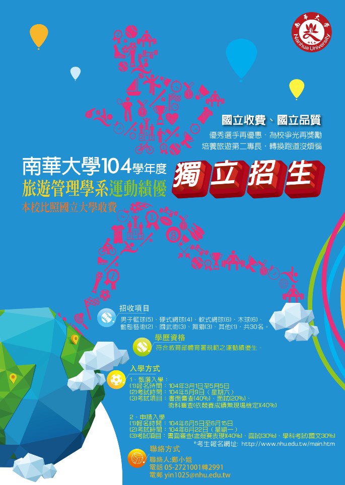 | 2015/04/01 南華大學104學年度運動績優生甄選入學單獨招生簡章 |