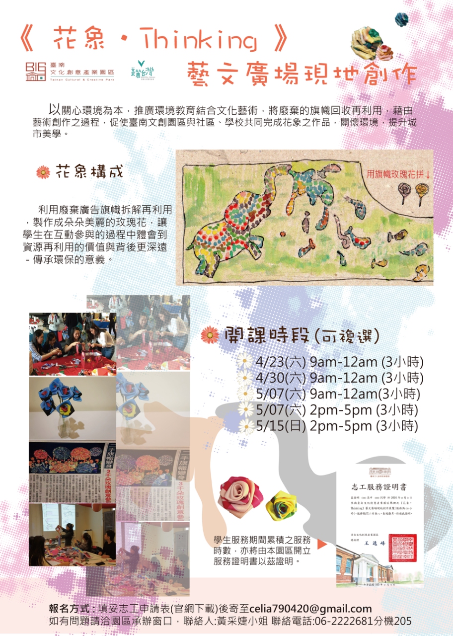 | 2016/04/06 臺南文化創意產業園區舉辦《花象‧Thinking》廣場現地創作展覽學生志工招募活動 |
