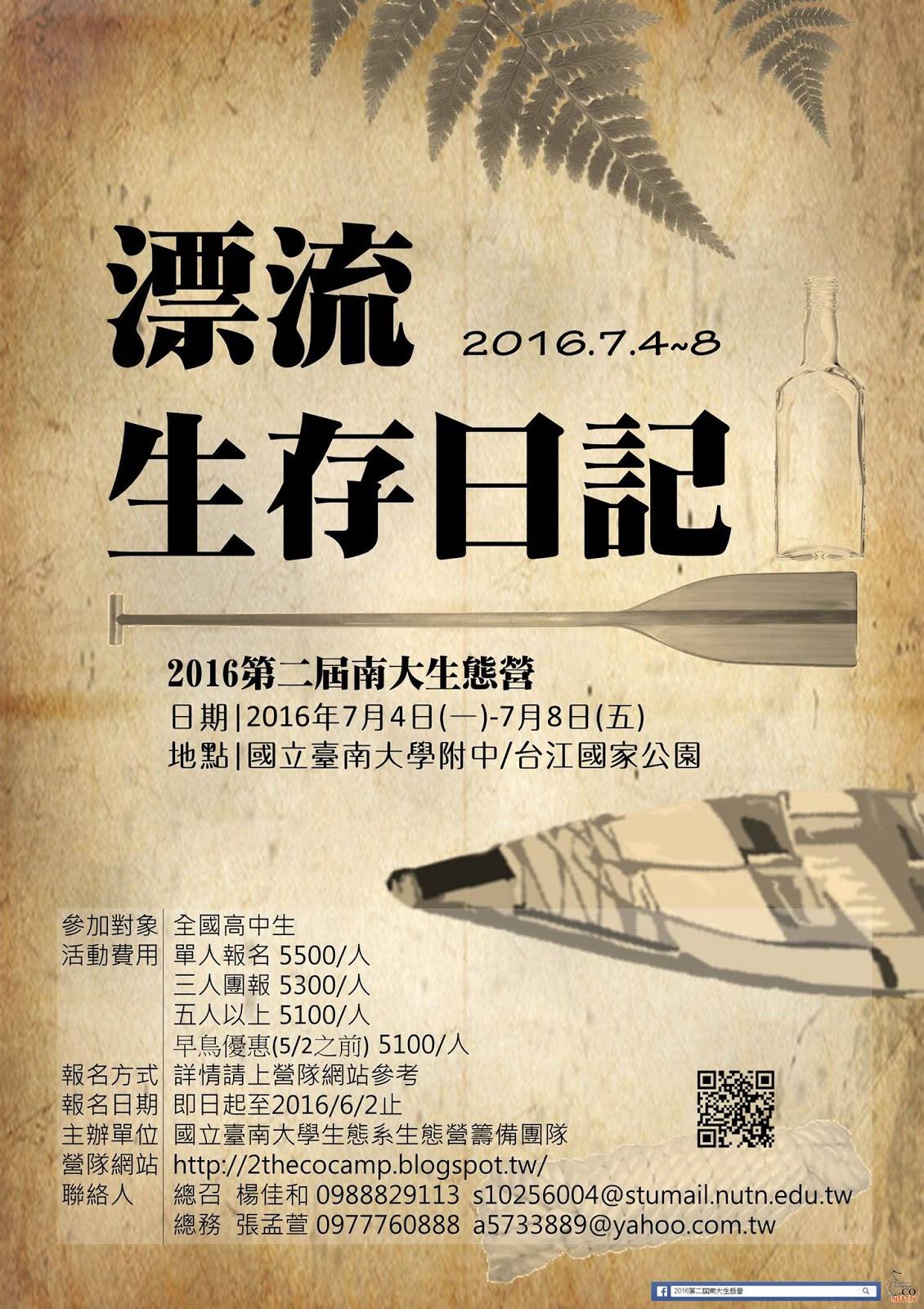 | 2016/04/11 轉知臺南大學辦理「第2屆南大生態營-漂流生存日記」 |