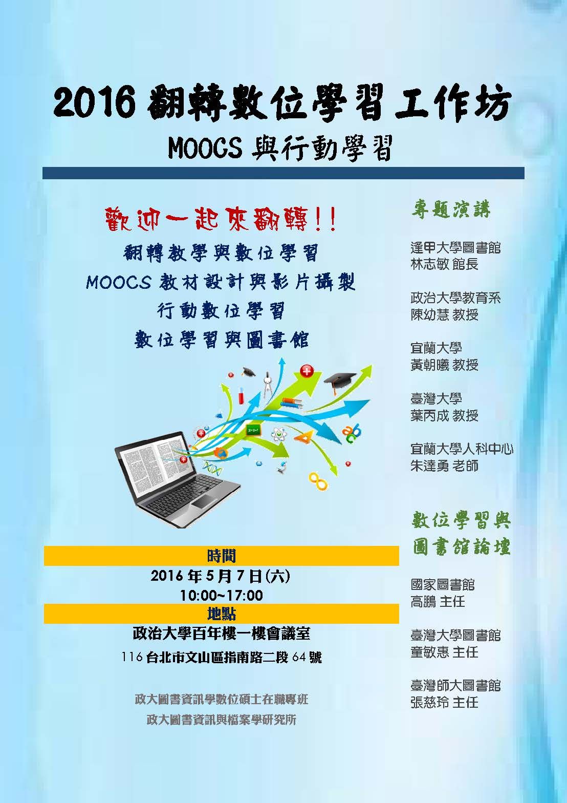 政治大學舉辦「2016翻轉數位學習: MOOCs 與行動學習工作坊」,詳情如附件。
