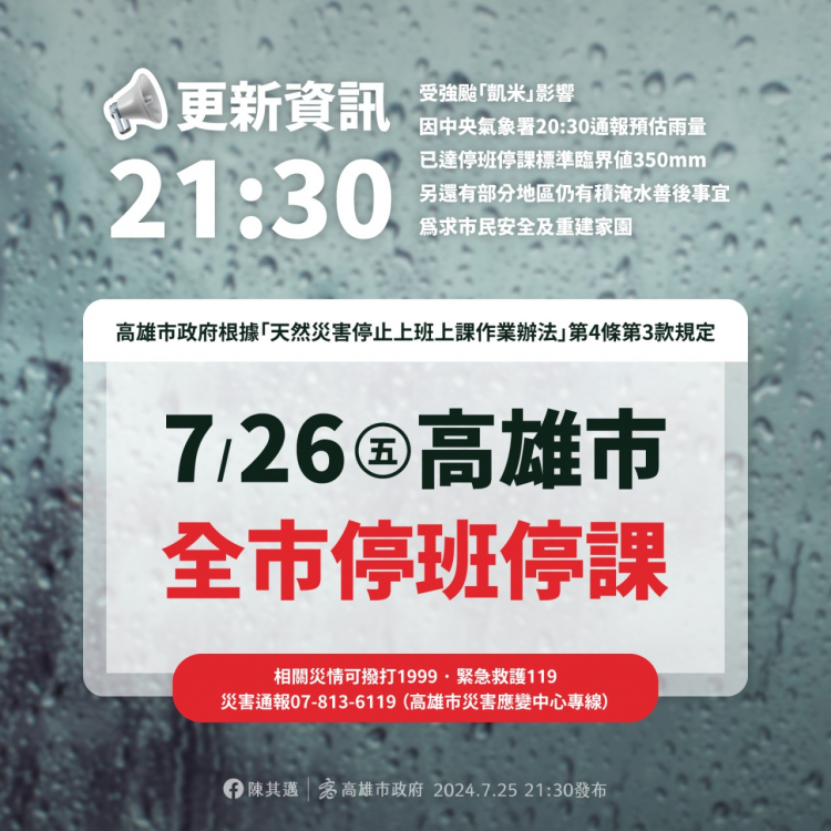 113年7月26日(五)高雄市政府宣布停班停課一日,暑期輔導課與重補修皆暫停一日