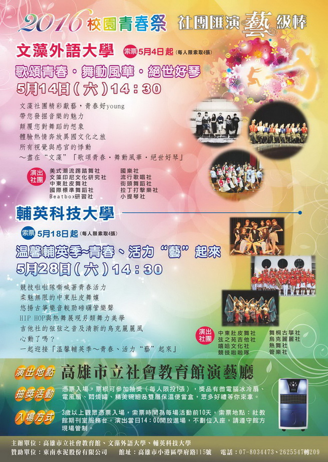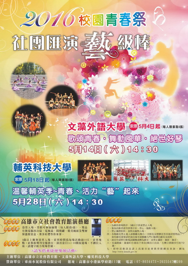 | 2016/04/22 轉知高雄市立社會教育館辦理「2016校園青春祭~社團匯演“藝”級棒」活動 |