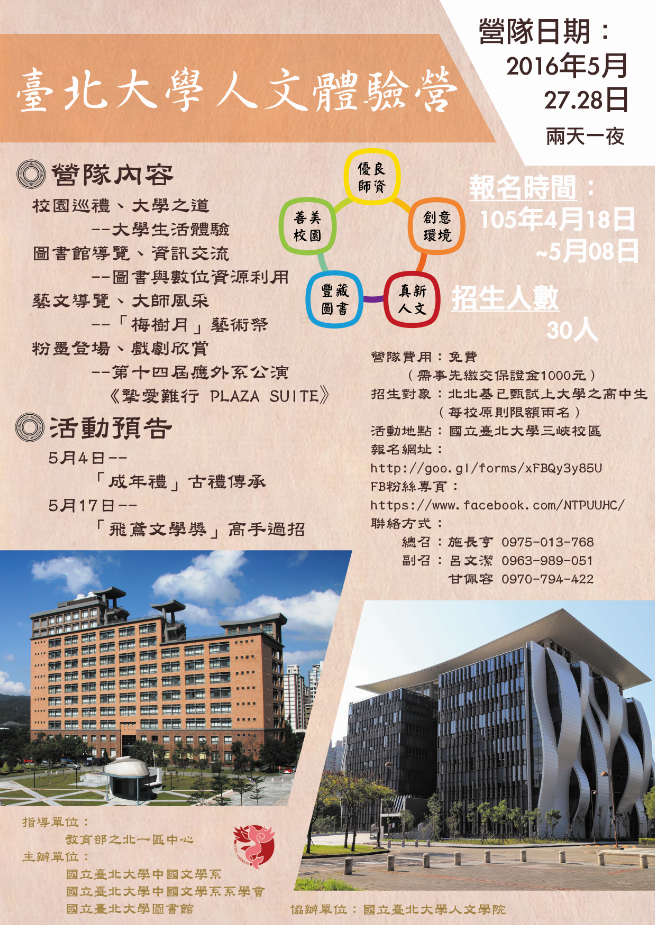 | 2016/04/25 轉知國立臺北大學辦理「大學人文體驗營」 |