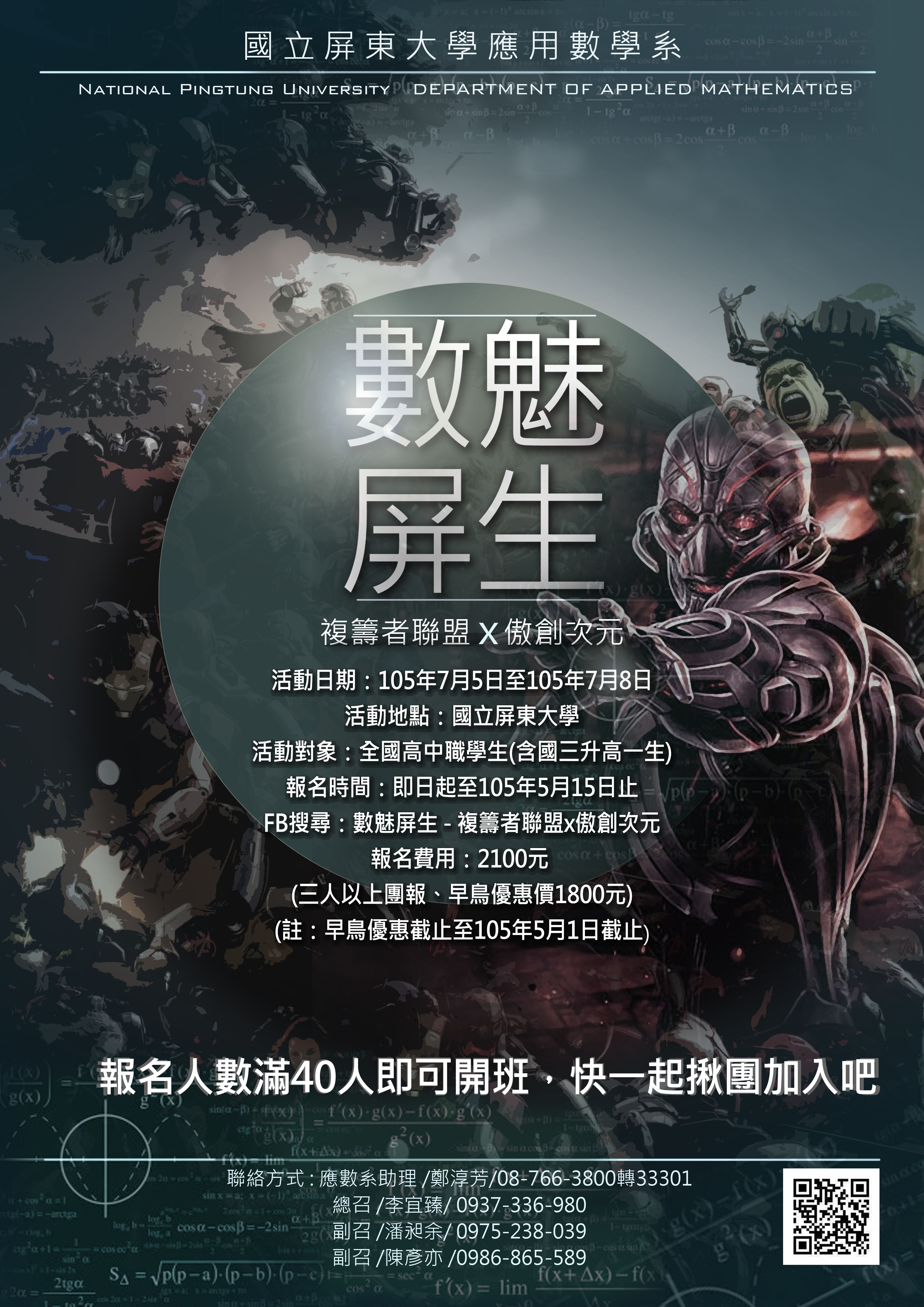 | 2016/04/26 國立屏東大學應用數學系系學會辦理「數魅屏生-複籌者聯盟x傲創次元」數學營隊 |