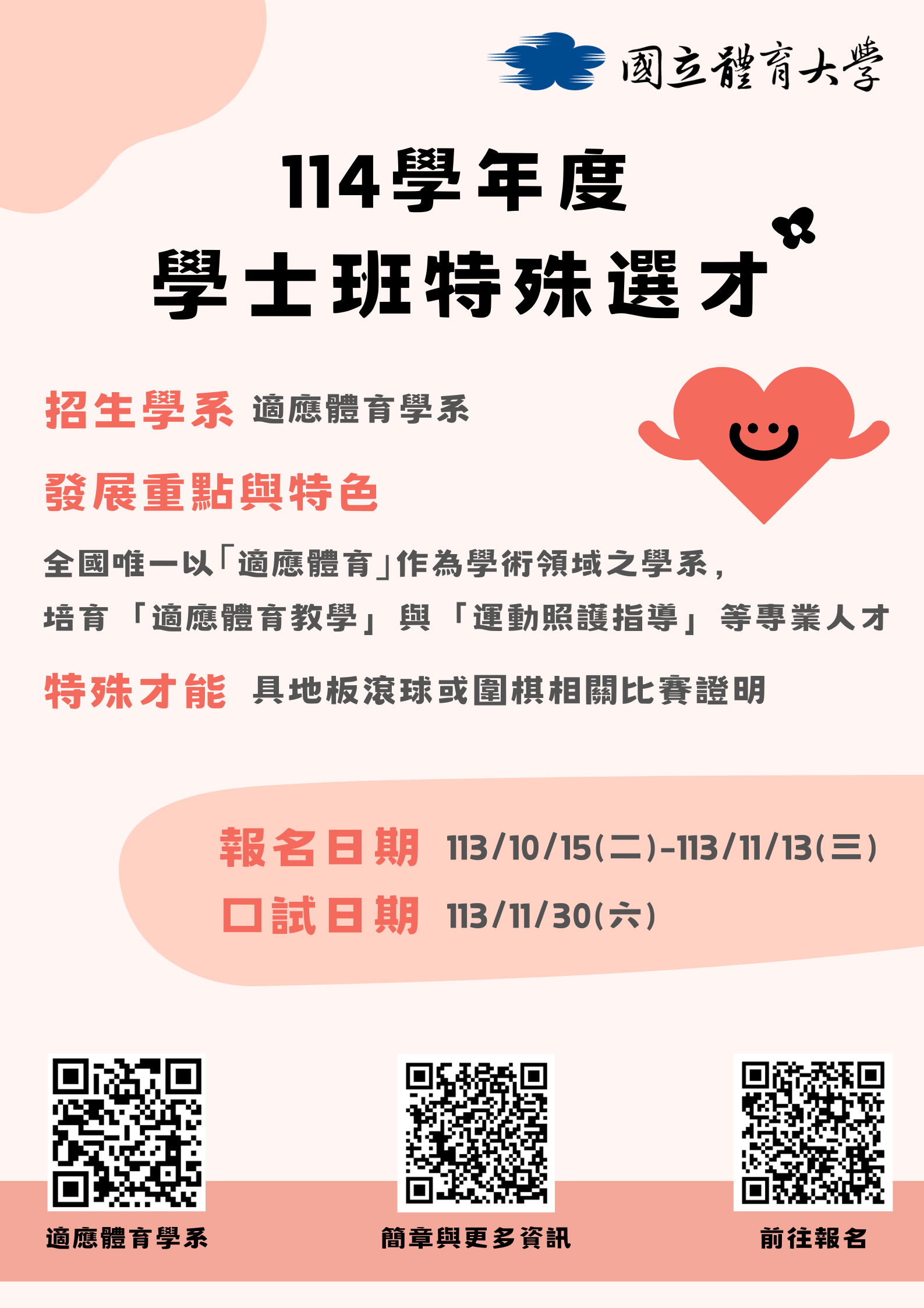 一、旨揭招生學系為該校適應體育學系(網址: https://ape.ntsu.edu.tw/)