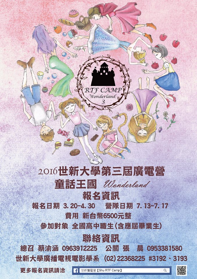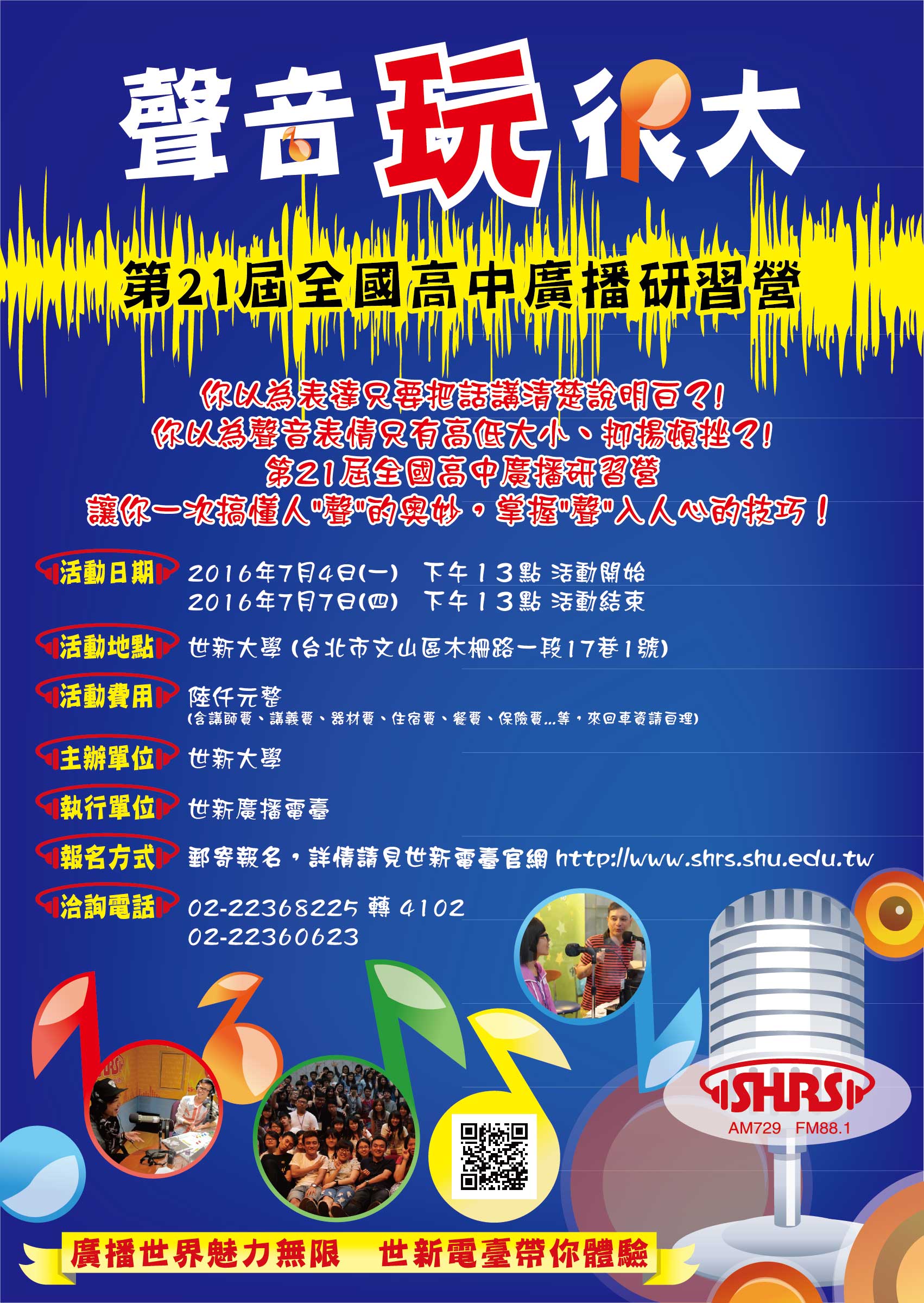 | 2016/04/28 「第21屆全國高中廣播研習營」及「第三屆廣電營【童話王國】」報名簡章 |