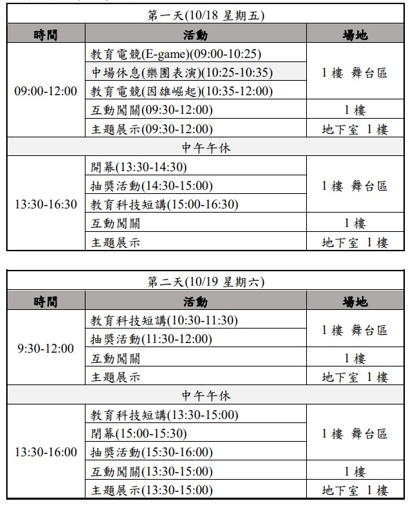 現場有教育電競、互動闖關、前瞻科技展示、 外縣市(含合作單位)資訊教育推動成果及教育科技短講等項目。活動現場另設置展示攤位提供體驗與互動, 並安排闖關抽獎活動。鼓勵本校師生踴躍參加,相關時程表詳見附檔。