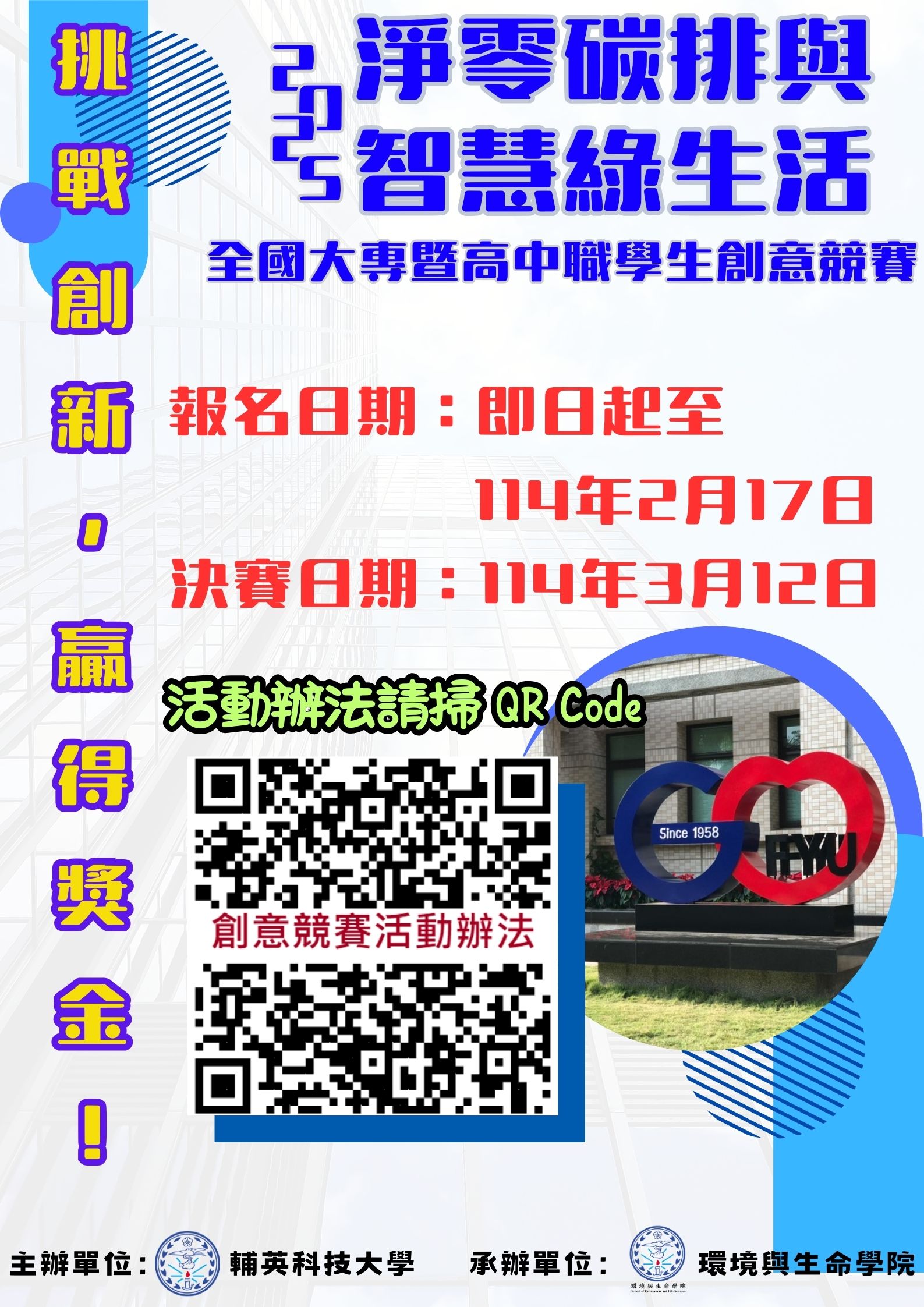 | 2024/10/11 2025全國大專暨高中職學生「淨零碳排與智慧綠 生活」創意競賽! |