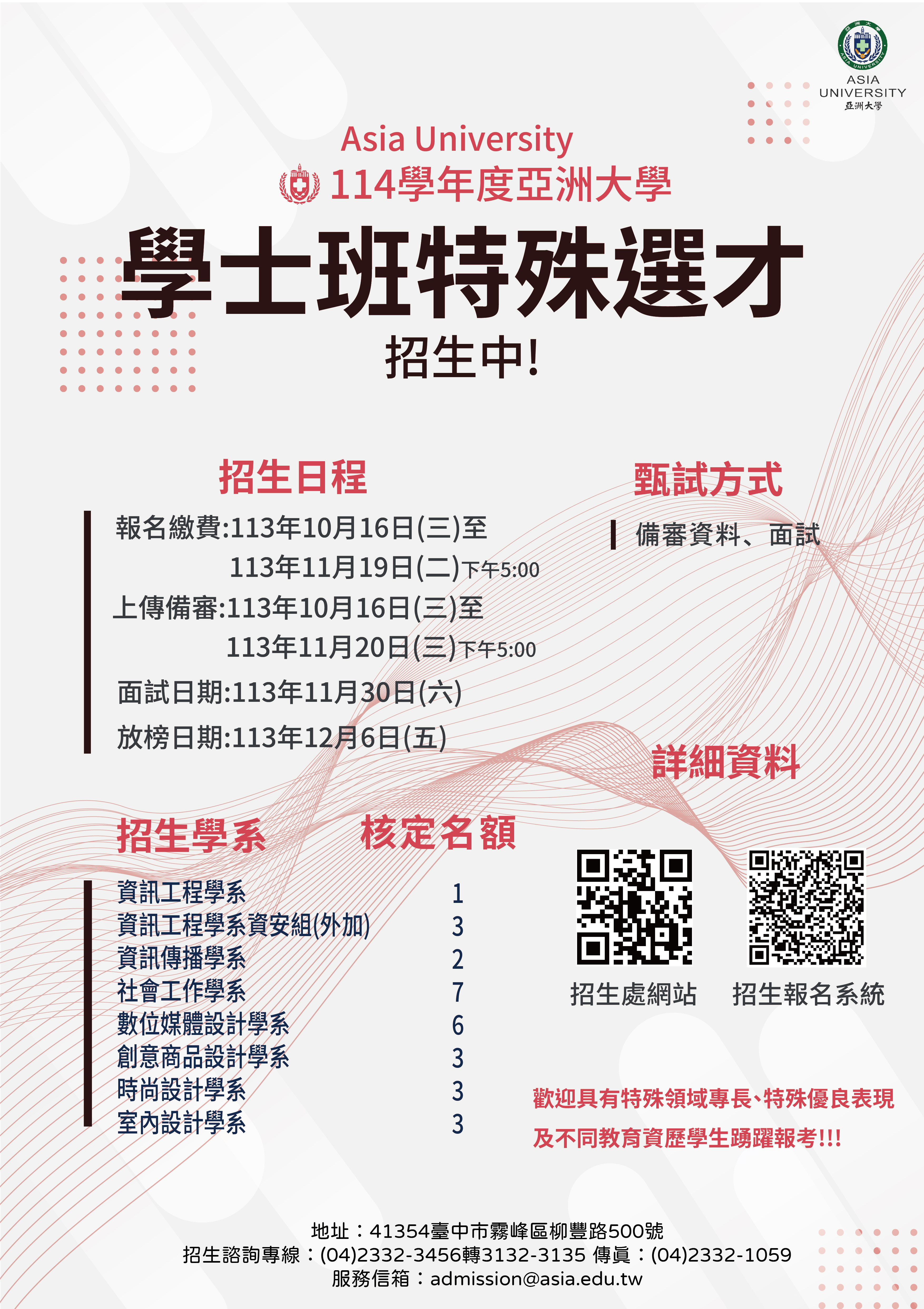 | 2024/10/14 亞洲大學114學年度學士班特殊選才招生資訊 |
