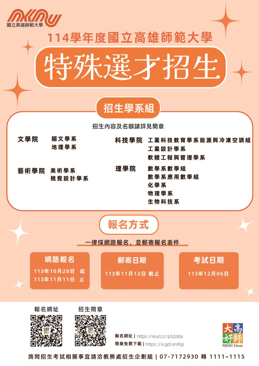 | 2024/10/18 國立高雄師範大學114學年度大學特殊選才招生簡章 |