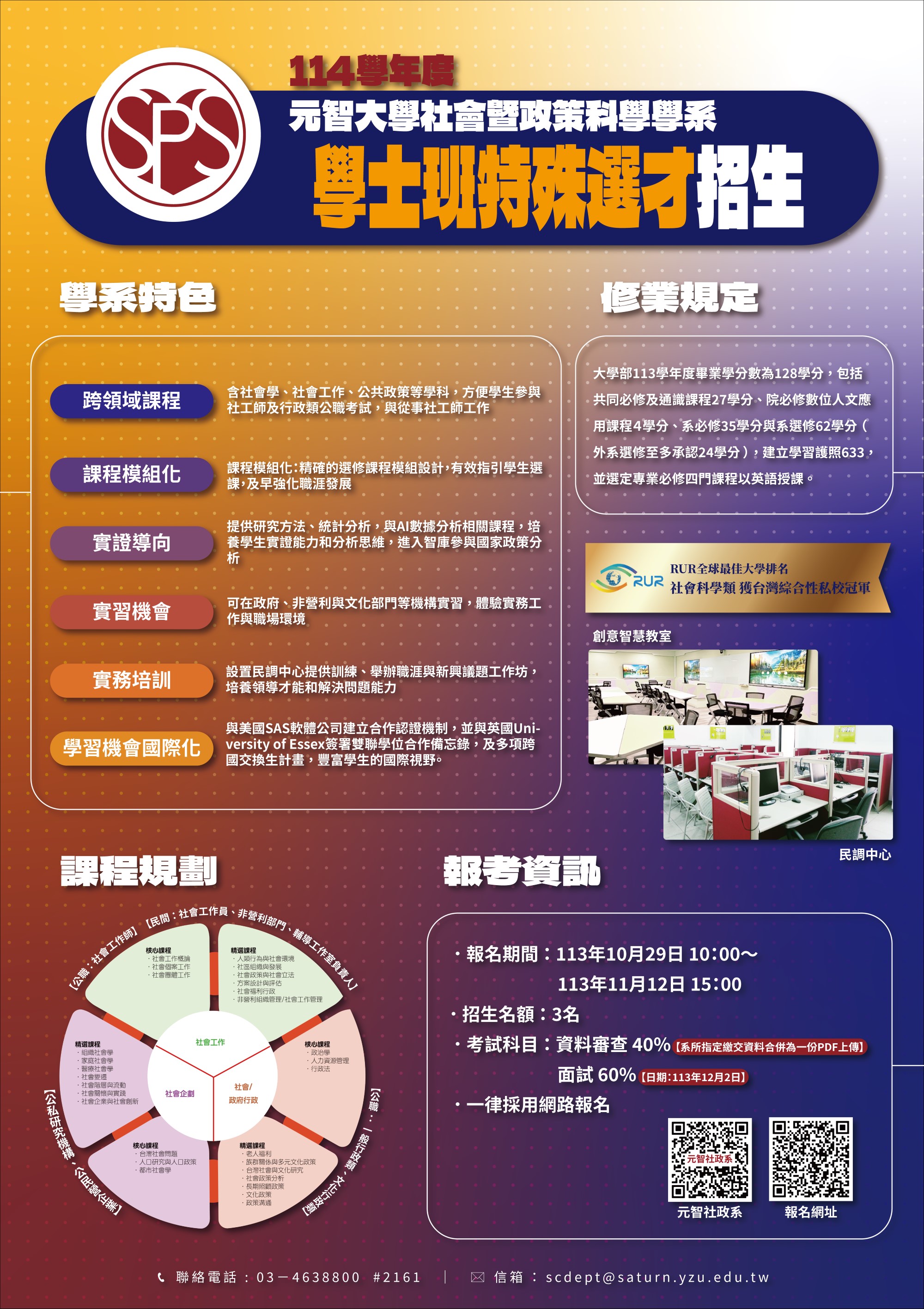 元智大學社會暨政策科學學系114學年度學士班特殊選才招生文宣,招生資訊網址:https://www.yzu.edu.tw/admissions/
