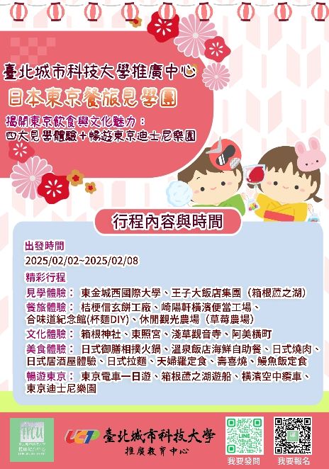 | 2024/10/30 轉知臺北城市科技大學推廣教育中心辦理「高中職日本東京餐旅見學團」招生資訊 |
