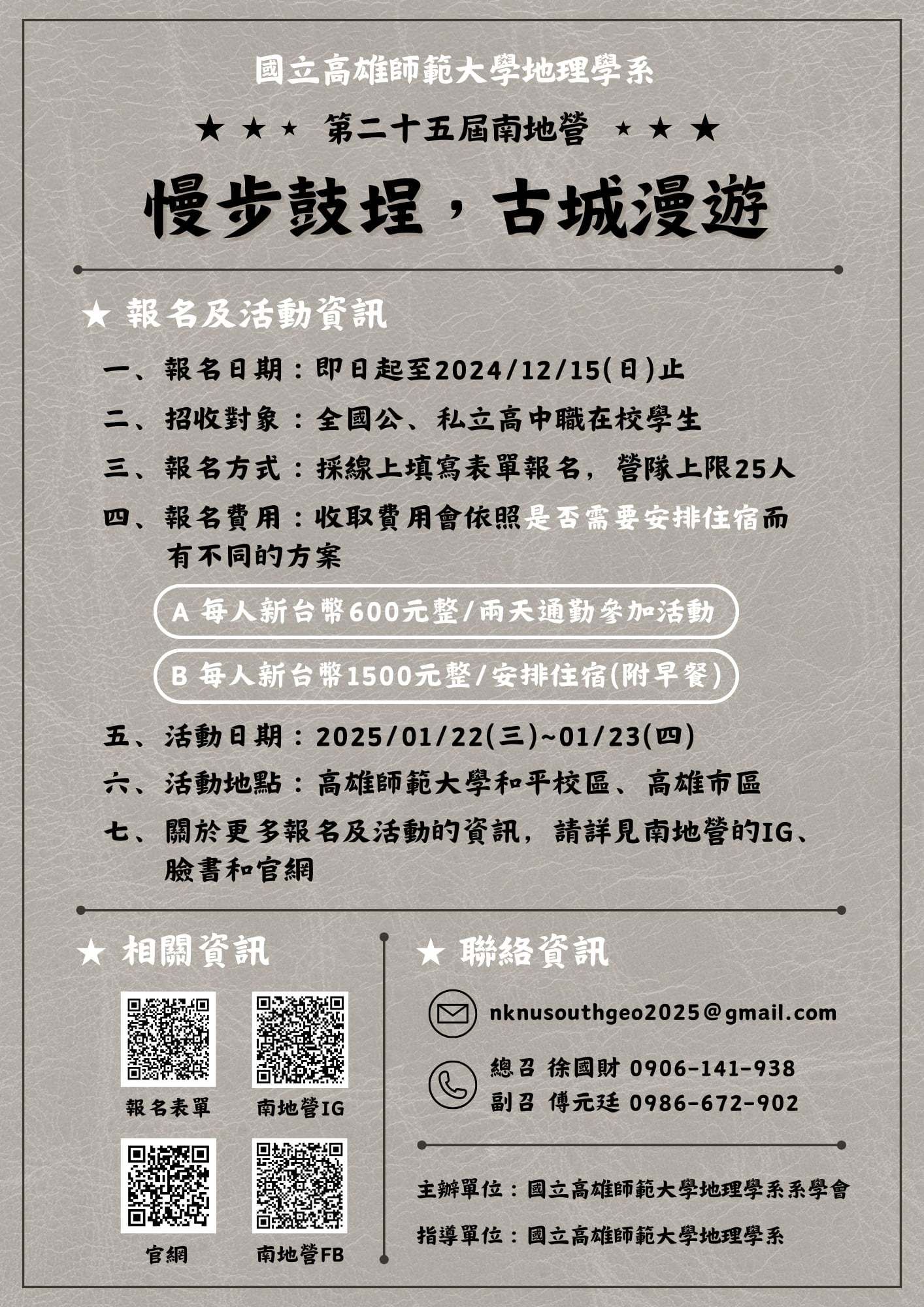 | 2024/11/05 第二十五屆高師大南地營〈慢步鼓埕,古城漫遊〉 |